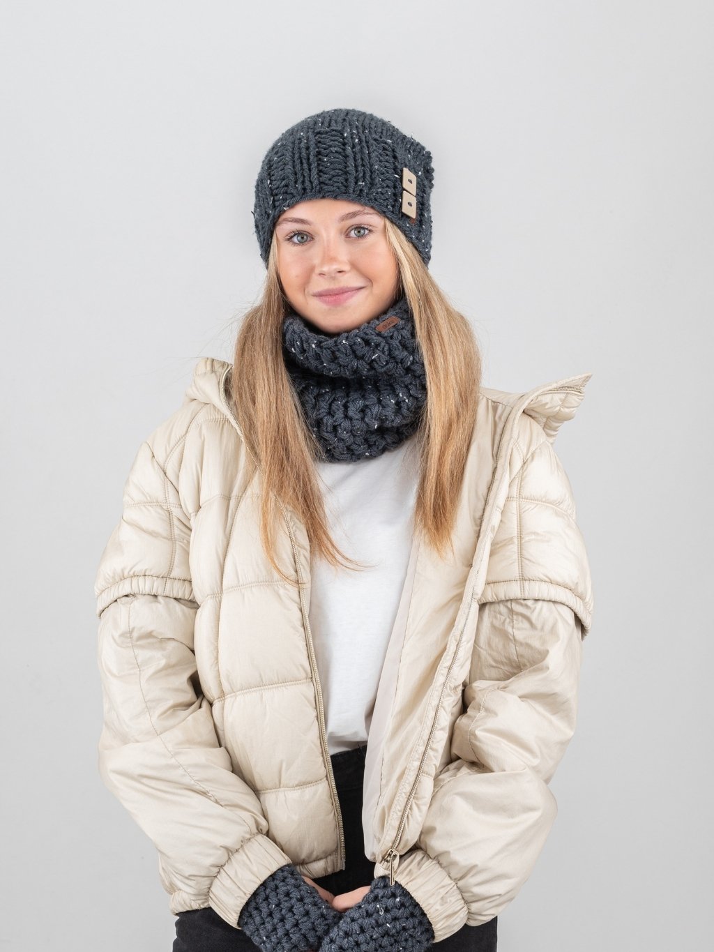 Detský set pletená čiapka a nákrčník b denim tweed pre deti 12-16 rokov
