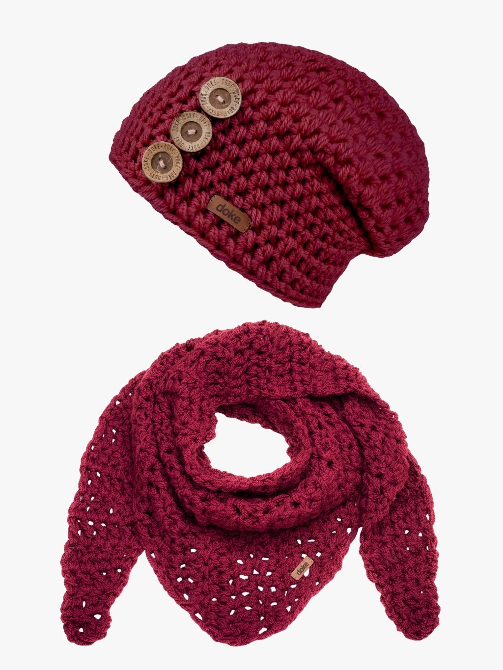 Štýlový set čiapky a šálu, ktorý v dňoch urputných mrazov zahreje a navyše vyladí každý Váš outfit. Ručne háčkovaná čiapka z hrejivej priadze je podšitá 10cm pruhom Funkčného úpletu, doplnená originálnymi drevenými gombíkmi s logom. Kombinovať môžete do setu so šálom a/alebo rukavicami. Doke je rýdzo česká výroba z jesenických hôr.