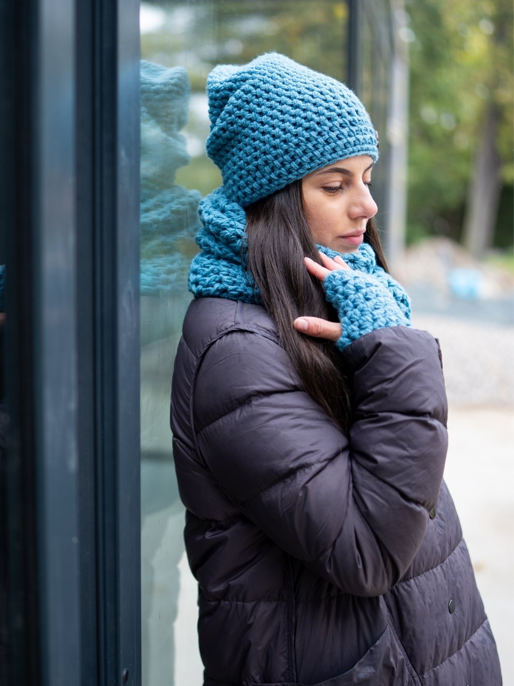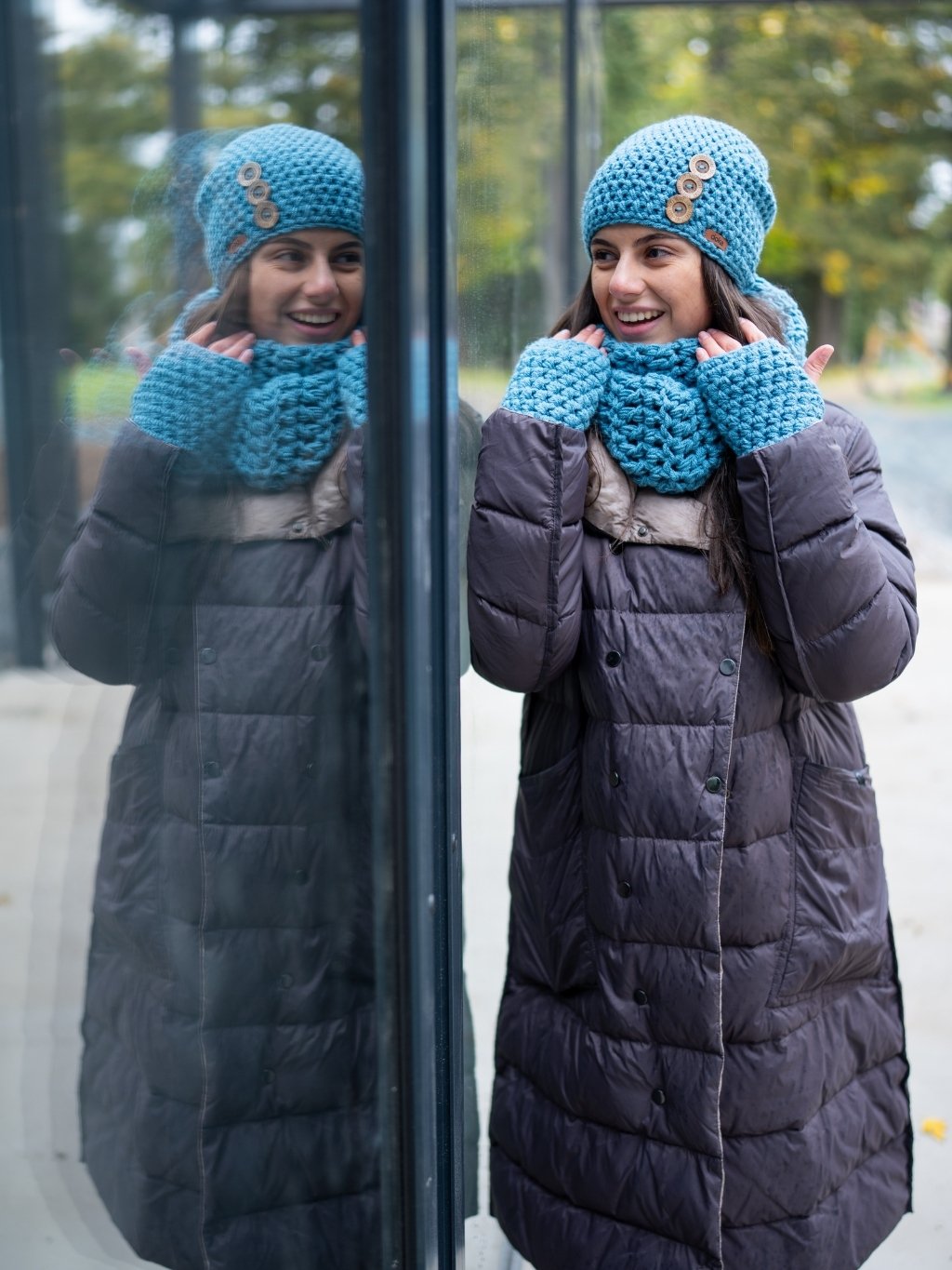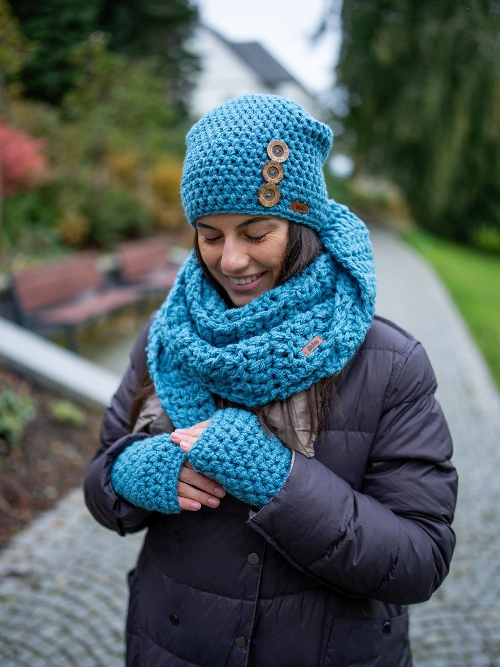 Ručne háčkovaná súprava z teplej nehrdzavejúcej priadze, kde je čiapka podšitá 10 cm pásom funkčnej pleteniny, a tak nesklame v meste ani pri športovom výkone. Nechajte sa rozmaznávať skvelým spoločníkom na mrazivé dni.
