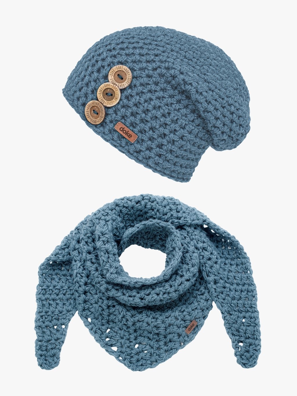 Štýlová súprava čiapky a šálu, ktorá vás zahreje v mrazivých dňoch a zároveň vylepší každý váš outfit. Ručne háčkovaná čiapka z hrejivej priadze je podšitá 10 cm pásom funkčného úpletu, doplnená originálnymi drevenými gombíkmi s logom. Môžete ju skombinovať do súpravy so šálom a/alebo rukavicami. Doke je čisto česká výroba z Jeseníkov.